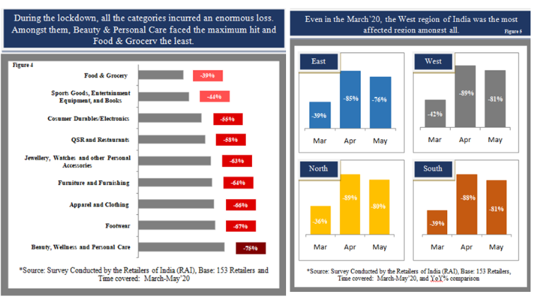 At the early stage of the lockdown, the Retailers Association of India (RAI) conducted a survey among 768 food and non-food retailers across the country, where more than 95% of non-food retailers responded that they closed their outlets during the lockdown and barely gained any revenue during that time. As per the study, except for Food & Grocery and Sports Goods, Entertainment, and Books, all other categories experienced more than 50% of loss, during March-May’20 (Figure 4). The survey also reported that the lockdown massively affected the country across the geography, but amongst them, the west region of India experienced the worst hit (Figure 5). According to the Confederation of All India Traders (CAIT), due to the double effects of COVID and lockdown, within the last two weeks of March’20, the Indian retail sector has lost approximately ~US$30 billion. They also predict that within the next few months, 20% of Indian retailers will oblige to wind up their business.