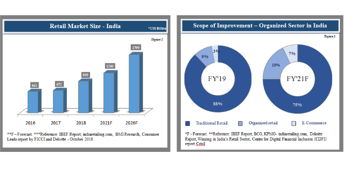 Speedy urbanization, increased purchasing power, adoption of digital techniques, and changing lifestyles are the few driving factors for the rapid growth of the Indian retail. According to the IBE/blog_images/F report, Indian retail is arising as one of the largest sectors in the economy, which contributes 10% to GDP and 8% of the country’s employment. Figure 2 represents a rising trend for Indian retail market size from 2016 to 2018. The graph also forecasts that in 2021 and 2026, the market size will be increase to US$1,200 billion and US$1,750 billion, respectively. As per Deloitte’s’ report, the Indian retail market is expecting to grow US$1.2 trillion by 2021. The growth majorly will be driven by the rise in the e-commerce market. The organized sector expected to increase to 22% – 25% in 2021, primarily due to the increasing internet penetration in the country and the growing involvement of international brands in the segment. According to the IBEF report, the Organized and E-commerce sector estimate to increase to 18% and 7% respectively in 2021 (Figure 3). Along with that, the share of traditional trade comprising local Kirana, and Mom and Pop stores will decline to 75% in 2021, due to shopping mode preference change by many shoppers.