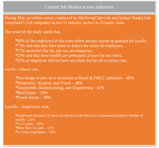 Not just the revenue but also the employment of the retail industry negatively affected by the pandemic and the lockdown. After being closed for more than two months, the Retail Industry started to resume its operations from June 8th. Around ten weeks of these complete closures adversely strike the retail industry, which leads to salary cuts and layoffs. As per the founder of TRRAIN (Trust for Retailers and Retail Association of India), the non-essential segment, which includes Fashion, Lifestyle, Travel & Tourism, etc. will observe a large number of layoffs due to this lockdown. During June, Shopper Stop, the county’s one of the oldest departmental store chains, confirmed its plan to lay off around 1000 employees and shut some underperforming stores, as both pandemic and lockdown unfavorably hit their sales. However, as per one of the company’s spokesperson, the company will rehire the employees, once everything gets normal.