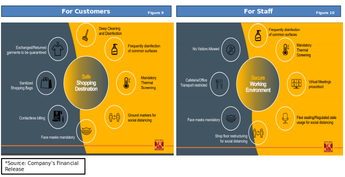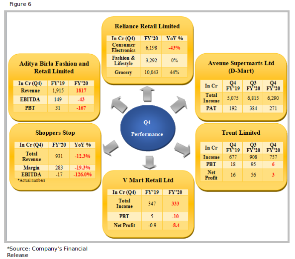 Reliance Retail Limited: Due to the emergence of the COVID situation, the company shut all its stores, particularly malls, from March 14th, and all non-grocery shops and e-tailing from March 22nd. The closure of stores severely impacted the performance of the quarter. The disruption to importing devices from overseas, during the pandemic situation also affected the sale performance of the Electronic segment. However, during Q4, the EBITDA increased by 33%, majorly driven by growth in Grocery, more B2C sales, and higher productivity.